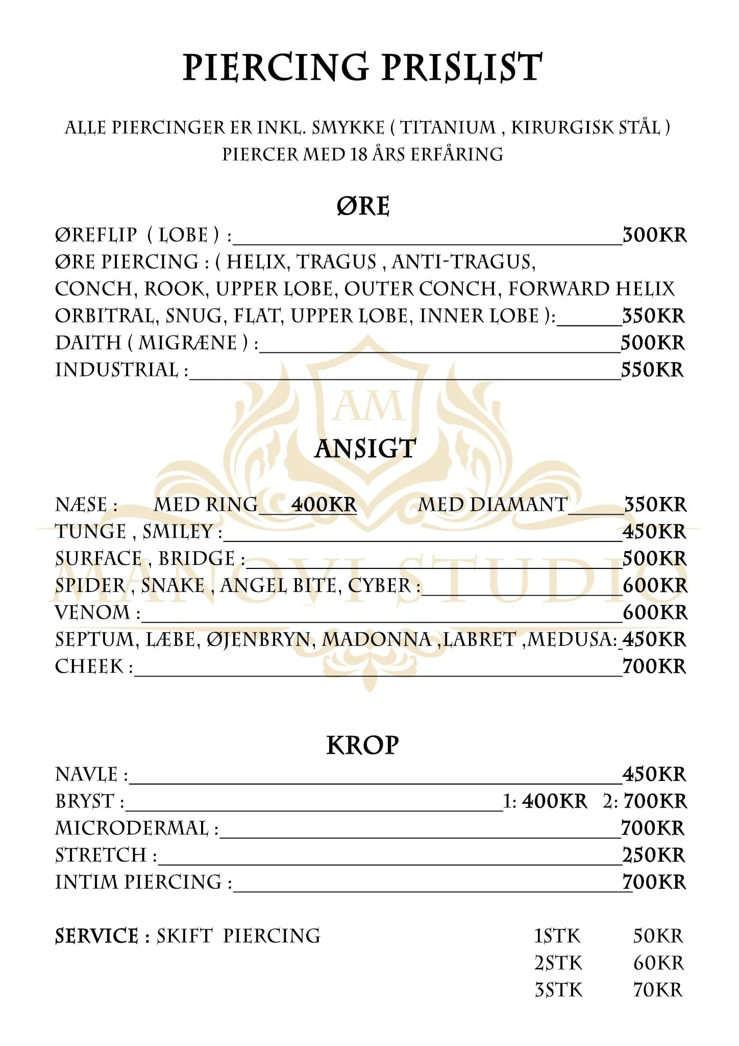 Minimal pris på en tatovering eller opfyldning er 500 OBS: Hvis depositum på 500 kr. ikke overføres indenfor 12 timer efter booking af tid, frafalder aftalen.