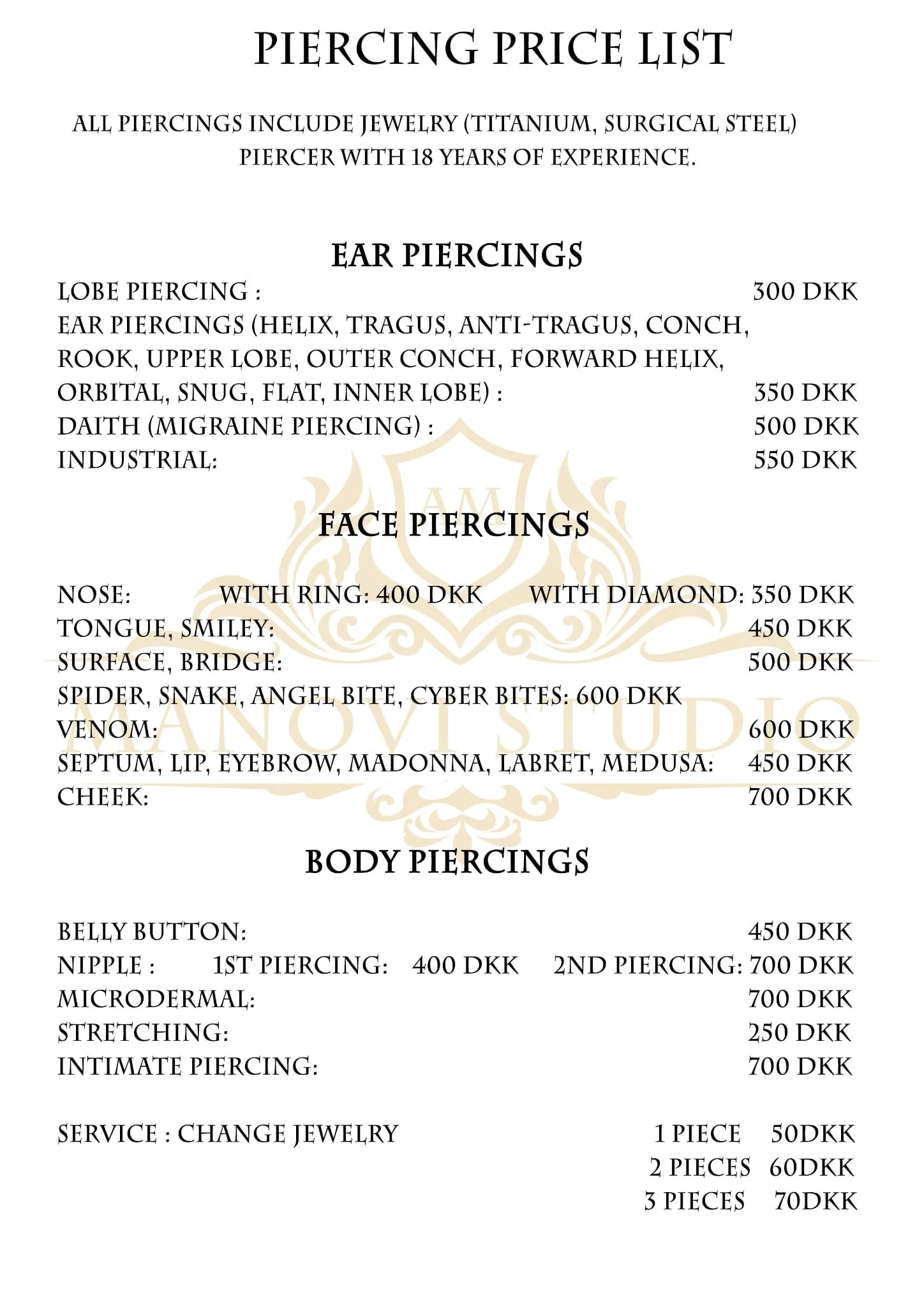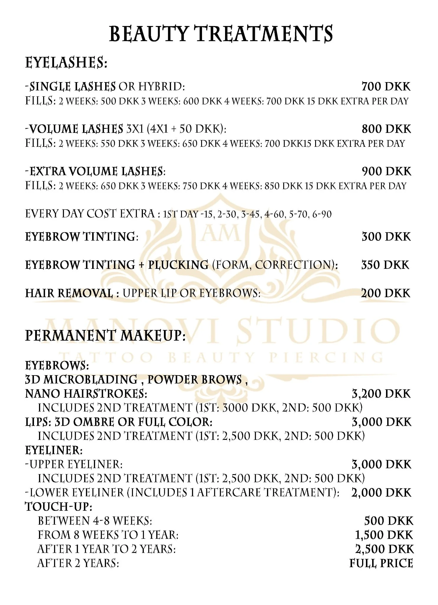 Minimum price for a tattoo or filling is 500 NOTE: If the deposit of DKK 500 is not transferred within 12 hours after booking the time, the agreement is canceled.
